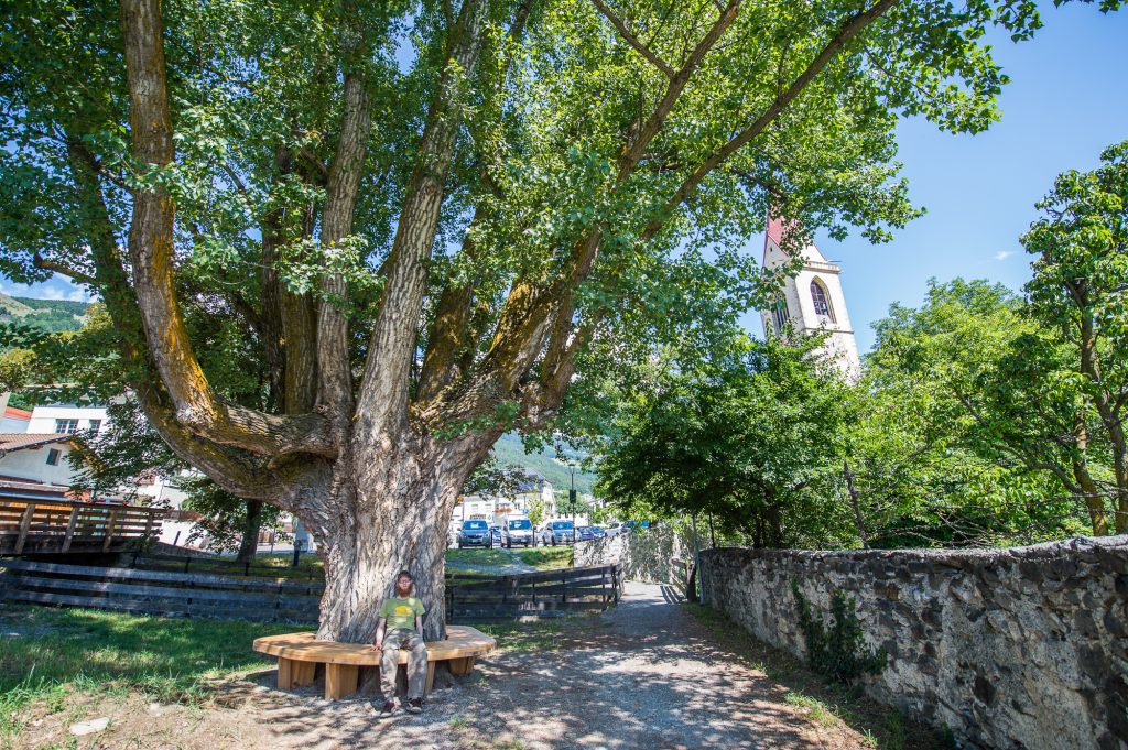 Die Heuernte war im vollem Gange. Auf den Wiesen um uns herum waren die Landwirte eifrig damit beschäftigt, das Heu einzuholen. Die Sonne schien sehr warm vom Himmel und der Boden war ziemlich trocken. In unserem Bulli saßen wir ohne Klimaanlage und es war ganz schön warm. Wenn ich jetzt daran denke (wir haben Mitte März und der richtige Frühling lässt auf sich warten) steigt wieder richtige Urlaubslust in mir auf. Es war jedoch beinahe zu warm, um unter der Mittagssonne weit zu fahren. So hielten wir ein weiteres mal an, als wir einen kleinen Burgturm in der Ferne erblickten. Der Ort, in dem wir landeten war deutlich kleiner als erwartet. Mals ist eine kleine italienische Marktgemeinde in Südtirol. Und ganz so, wie es in Italien üblich ist, waren die Bürgersteige um die Mittagszeit hochgeklappt. So gingen wir eine kleine Runde im Schneckentempo durch die Straßen und setzten uns kurz darauf in den Schatten unseres Bullis und gönnten uns einen kleinen Mittagssnack.